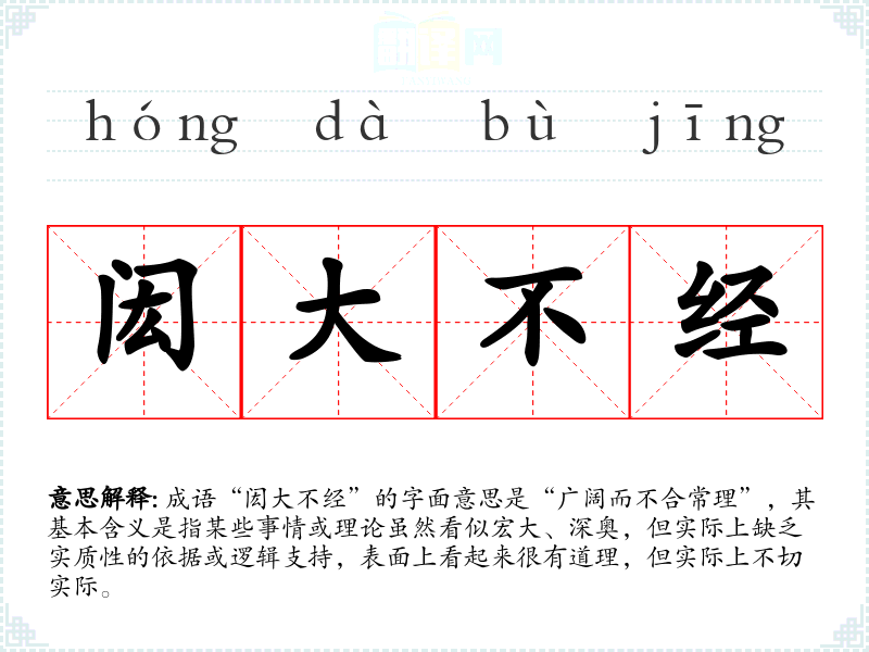 | 闳大不经 | 指不着边际,不合常理;近乎荒诞,没有根据。 |