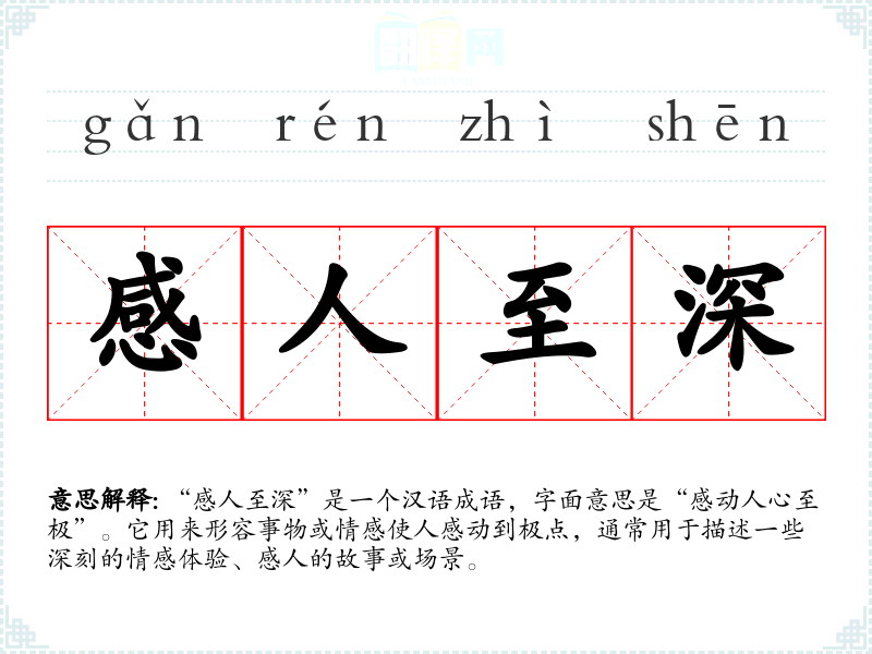 “感人至深”是一个汉语成语,字面意思是“感动人心至极”。它用来形容事物或情感使人感动到极点,通常用于描述一些深刻的情感体验、感人的故事或场景。