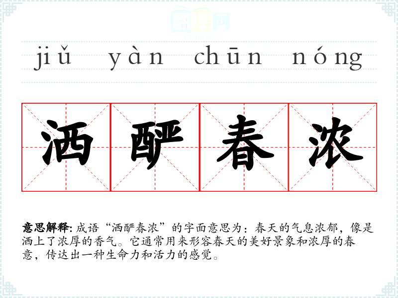 成语“洒酽春浓”的字面意思为:春天的气息浓郁,像是洒上了浓厚的香气。它通常用来形容春天的美好景象和浓厚的春意,传达出一种生命力和活力的感觉。