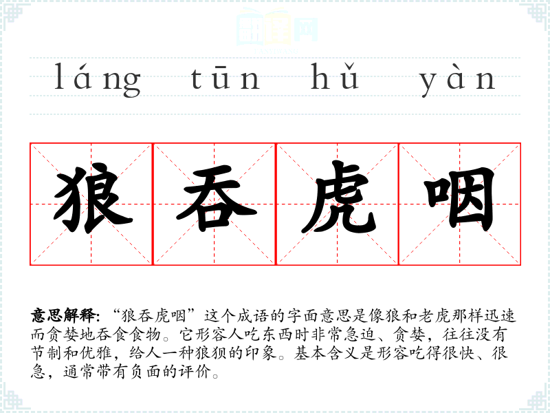 “狼吞虎咽”这个成语的字面意思是像狼和**那样迅速而贪婪地吞食食物。它形容人吃东西时非常急迫、贪婪,往往没有节制和优雅,给人一种狼狈的印象。基本含义是形容吃得很快、很急,通常带有负面的评价。