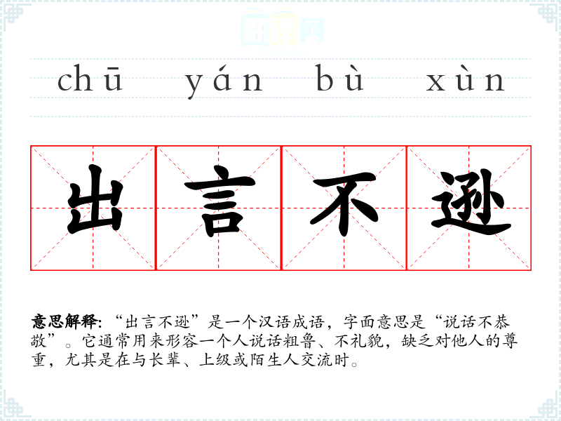 “出言不逊”是一个汉语成语,字面意思是“说话不恭敬”。它通常用来形容一个人说话粗鲁、不礼貌,缺乏对他人的尊重,尤其是在与长辈、上级或陌生人交流时。