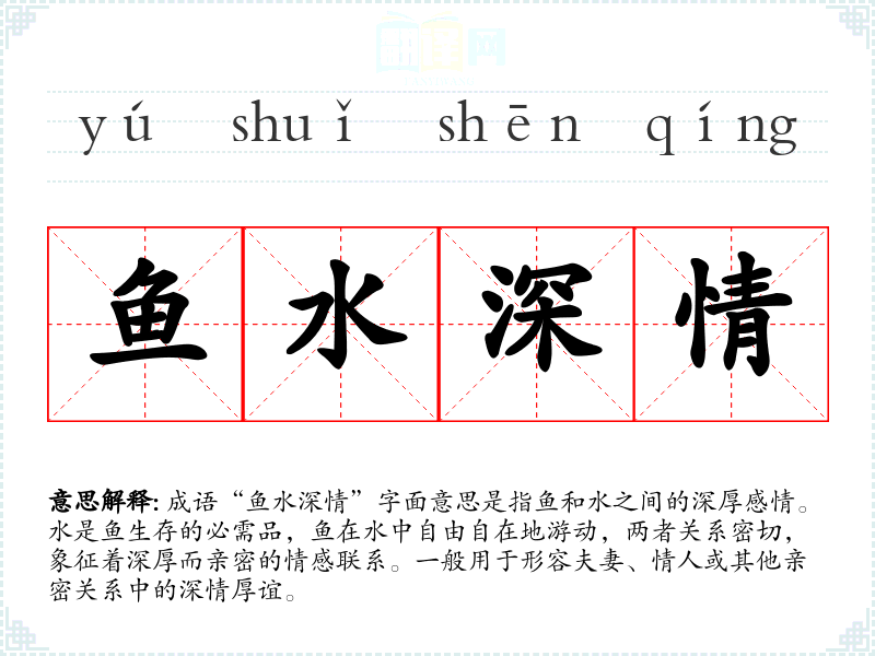 成语“鱼水深情”字面意思是指鱼和水之间的深厚感情。水是鱼生存的必需品,鱼在水中自由自在地游动,两者关系密切,象征着深厚而亲密的情感联系。一般用于形容夫妻、情人或其他亲密关系中的深情厚谊。