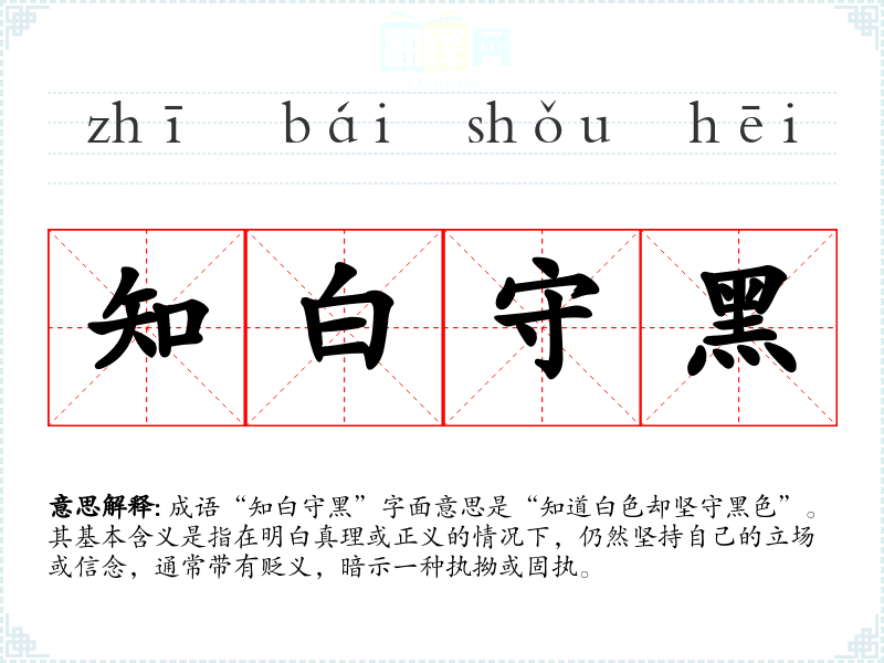 成语“知白守黑”字面意思是“知道白色却坚守黑色”。其基本含义是指在明白真理或正义的情况下,仍然坚持自己的立场或信念,通常带有贬义,暗示一种执拗或固执。