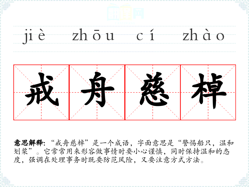“戒舟慈棹”是一个成语,字面意思是“警惕船只,温和划桨”。它常常用来形容做事情时要小心谨慎,同时保持温和的态度,强调在处理事务时既要防范风险,又要注意方式方法。
