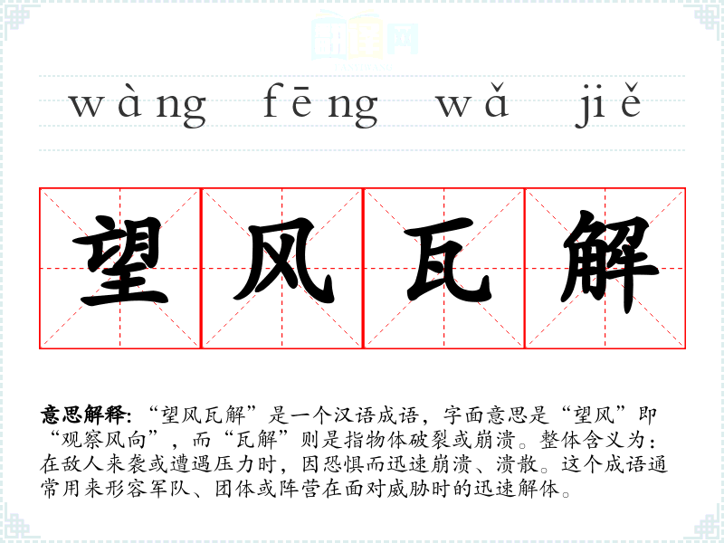 “望风瓦解”是一个汉语成语,字面意思是“望风”即“观察风向”,而“瓦解”则是指物体破裂或崩溃。整体含义为:在敌人来袭或遭遇压力时,因恐惧而迅速崩溃、溃散。这个成语通常用来形容军队、团体或阵营在面对威胁时的迅速解体。