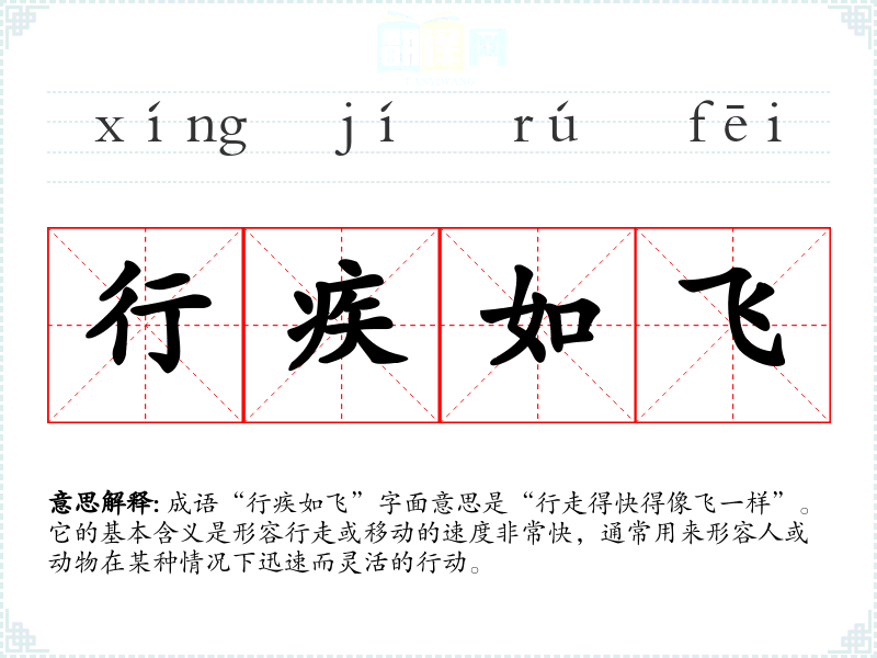 成语“行疾如飞”字面意思是“行走得快得像飞一样”。它的基本含义是形容行走或移动的速度非常快,通常用来形容人或动物在某种情况下迅速而灵活的行动。