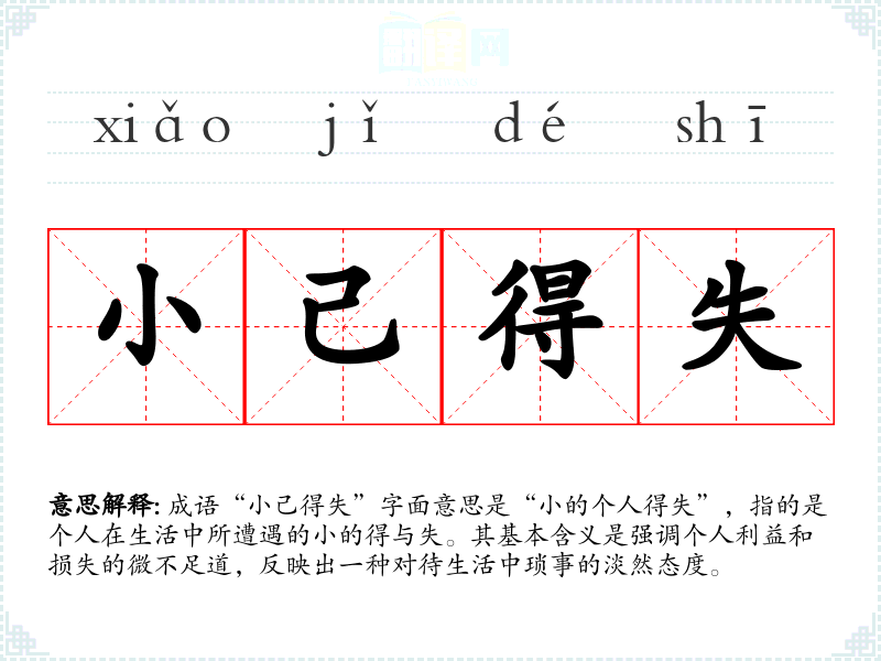 成语“小己得失”字面意思是“小的个人得失”,指的是个人在生活中所遭遇的小的得与失。其基本含义是强调个人利益和损失的微不足道,反映出一种对待生活中琐事的淡然态度。