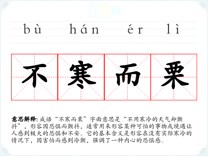 | 不寒而栗 | 栗:畏惧,发抖。不冷而发抖。形容非常恐惧。 |