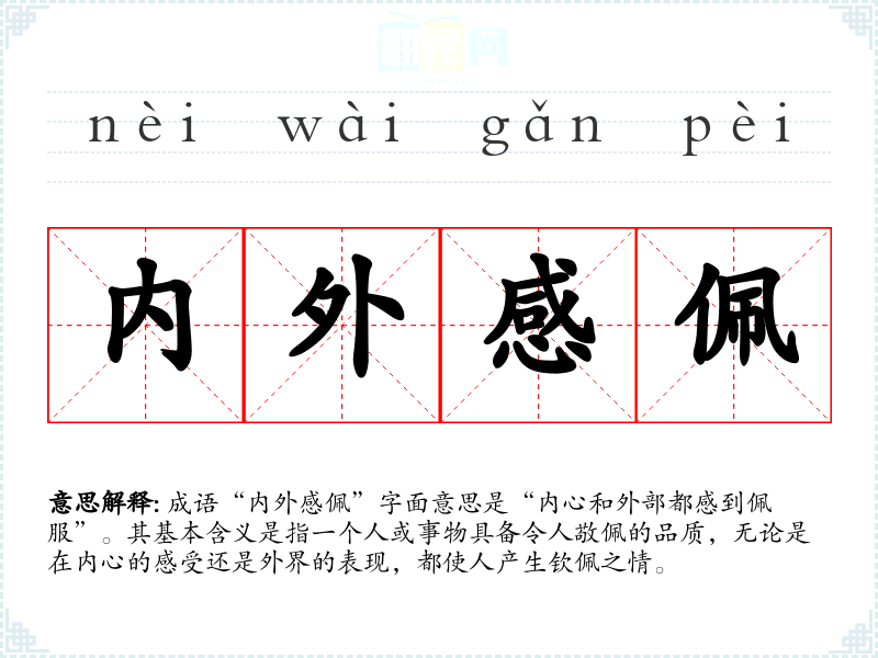 成语“内外感佩”字面意思是“内心和外部都感到佩服”。其基本含义是指一个人或事物具备令人敬佩的品质,无论是在内心的感受还是外界的表现,都使人产生钦佩之情。