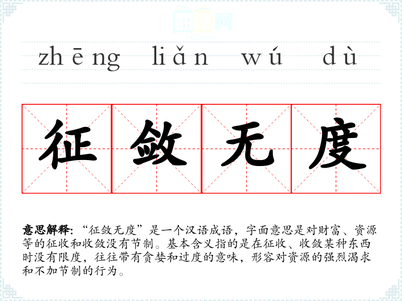 “征敛无度”并没有明确的古代典故或文献出处,但从字面上看,“征”指的是征收、征集,“敛”指的是收敛、聚集,“无度”则表示没有限制、没有节制。这个成语可以看作对古代统治者或官员在征税、征用资源时过度行为的批评,反映了对贪婪行为的警惕。