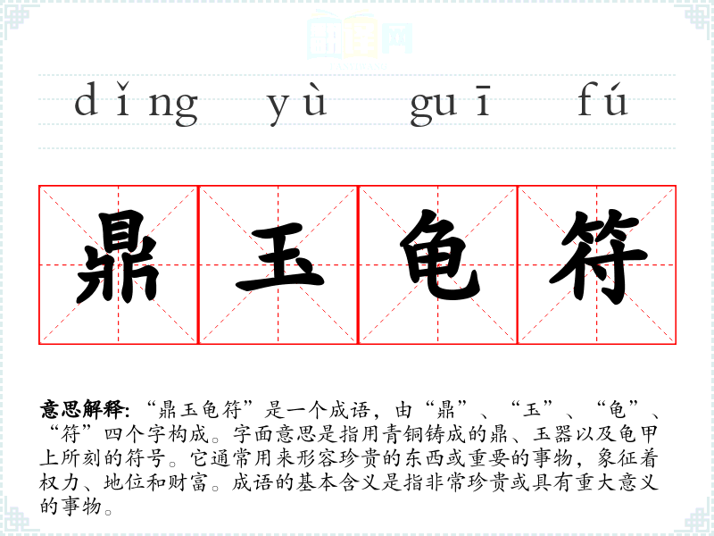 “鼎玉龟符”是一个成语,由“鼎”、“玉”、“龟”、“符”四个字构成。字面意思是指用青铜铸成的鼎、玉器以及龟甲上所刻的符号。它通常用来形容珍贵的东西或重要的事物,象征着权力、地位和财富。成语的基本含义是指非常珍贵或具有重大意义的事物。