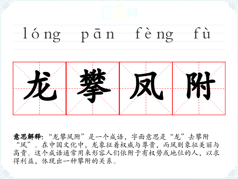 “龙攀凤附”是一个成语,字面意思是“龙”去攀附“凤”。在**文化中,龙象征着权威与尊贵,而凤则象征美丽与高贵。这个成语通常用来形容人们依附于有权势或地位的人,以求得利益,体现出一种攀附的关系。