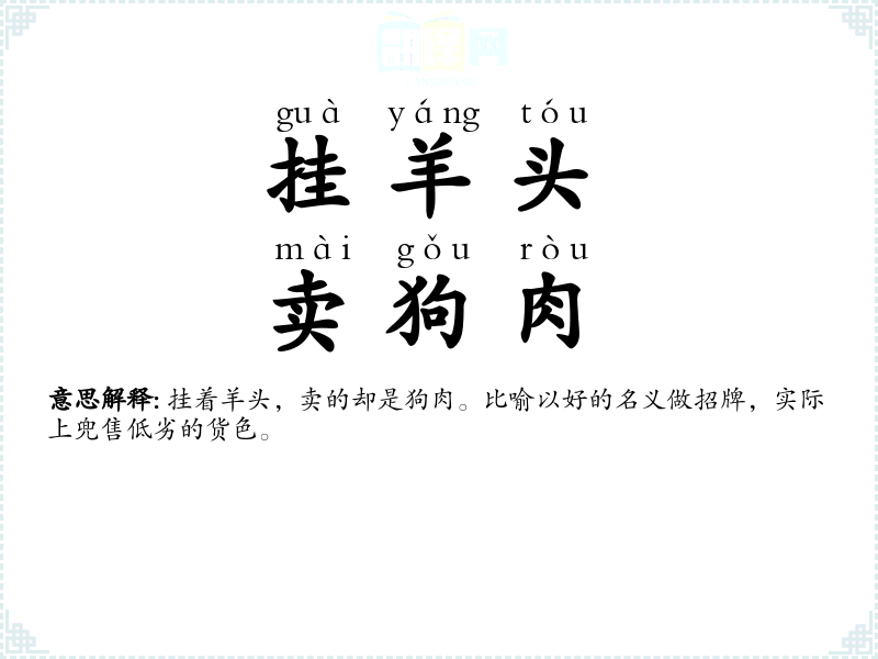 挂着羊头,卖的却是狗肉。比喻以好的名义做招牌,实际上兜售低劣的货色。