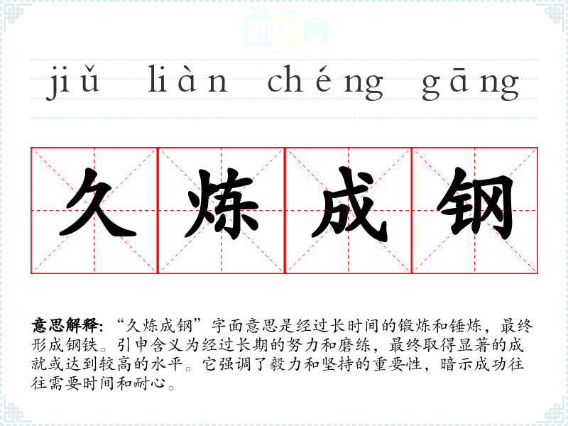 “久炼成钢”这个成语源于金属冶炼的过程。在古代,炼铁和炼钢是需要经过多次高温锻炼和加工的,只有经过反复的锤炼,才能最终形成坚硬的钢铁。虽然该成语具体的文学出处不详,但其背后的理念在中华文化中广泛流传,与“滴水穿石”、“百折不挠”等成语有相似的哲理。