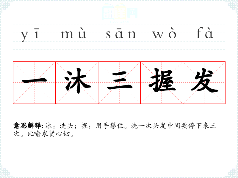 | 一沐三握发 | 沐:洗头;握:用手攥住。洗一次头发中间要停下来三次。比喻求贤心切。 |