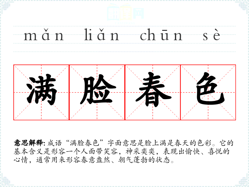 成语“满脸春色”字面意思是脸上满是春天的色彩。它的基本含义是形容一个人面带笑容,神采奕奕,表现出愉快、喜悦的心情,通常用来形容春意盎然、朝气蓬勃的状态。
