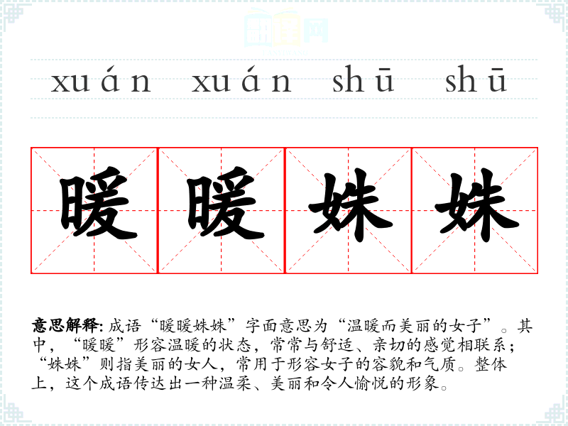 “暖暖姝姝”这一成语的来源较为模糊,可能并没有明确的历史典故或文献记载。然而,从字面上看,可以与古代诗词中对美丽和温柔女子的描写相联系,体现了古人对女性美的赞美与向往。