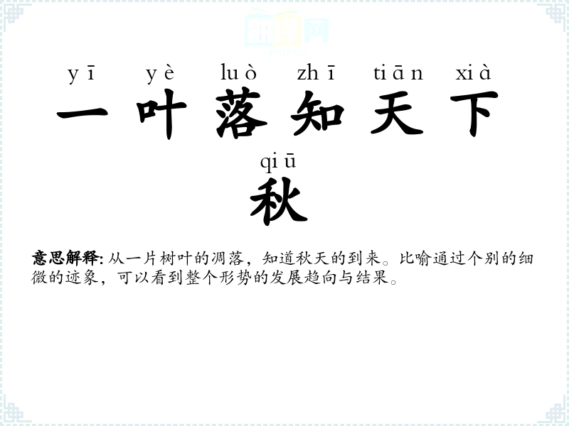 | 一叶落知天下秋 | 从一片树叶的凋落,知道秋天的到来。比喻通过个别的细微的迹象,可以看到整个形势的发展趋向与结果。 |
