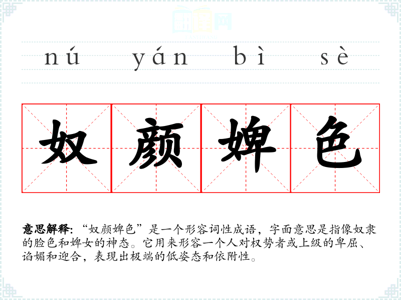 “奴颜婢色”是一个形容词性成语,字面意思是指像奴隶的脸色和婢女的神态。它用来形容一个人对权势者或上级的卑屈、谄媚和迎合,表现出极端的低姿态和依附性。