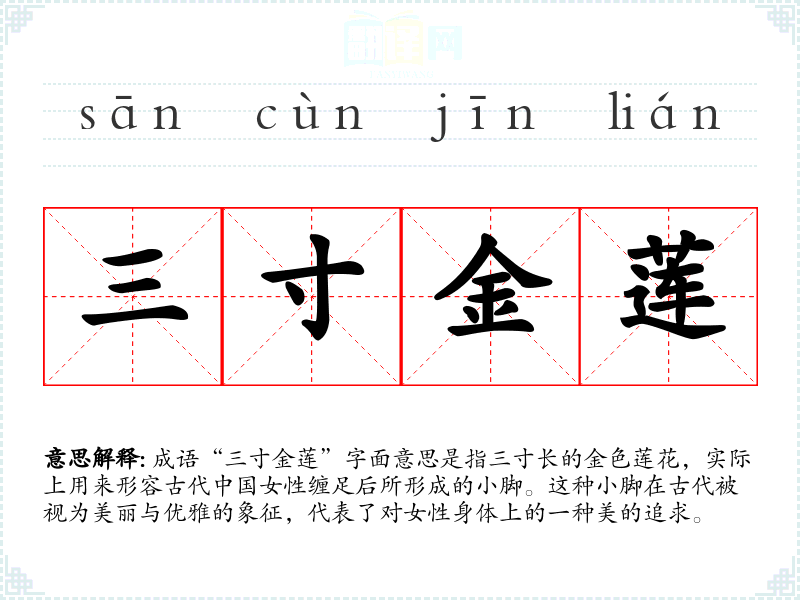 成语“三寸金莲”字面意思是指三寸长的金色莲花,实际上用来形容古代**女性缠足后所形成的小脚。这种小脚在古代被视为美丽与优雅的象征,代表了对女性身体上的一种美的追求。