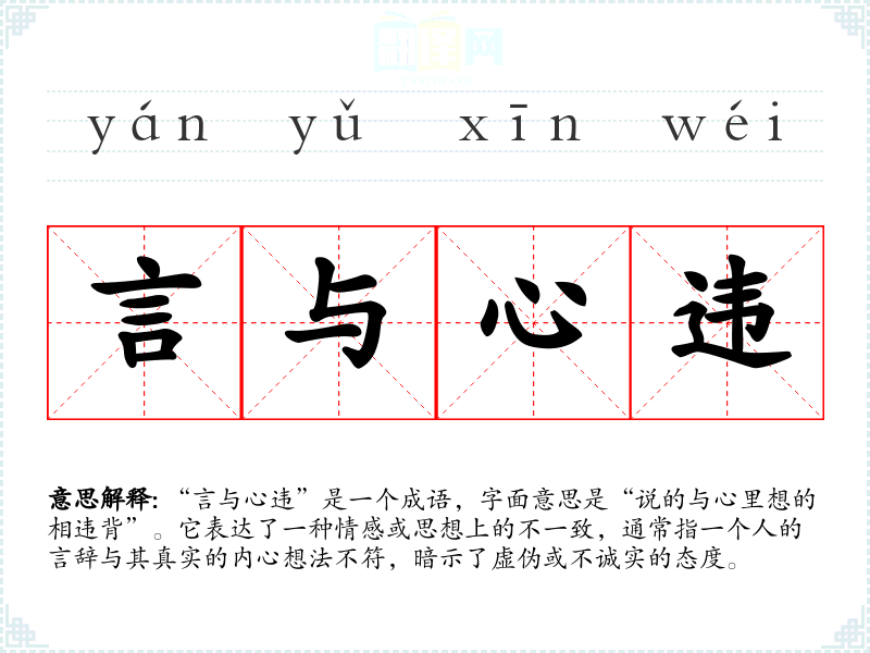 “言与心违”是一个成语,字面意思是“说的与心里想的相违背”。它表达了一种情感或思想上的不一致,通常指一个人的言辞与其真实的内心想法不符,暗示了虚伪或不诚实的态度。
