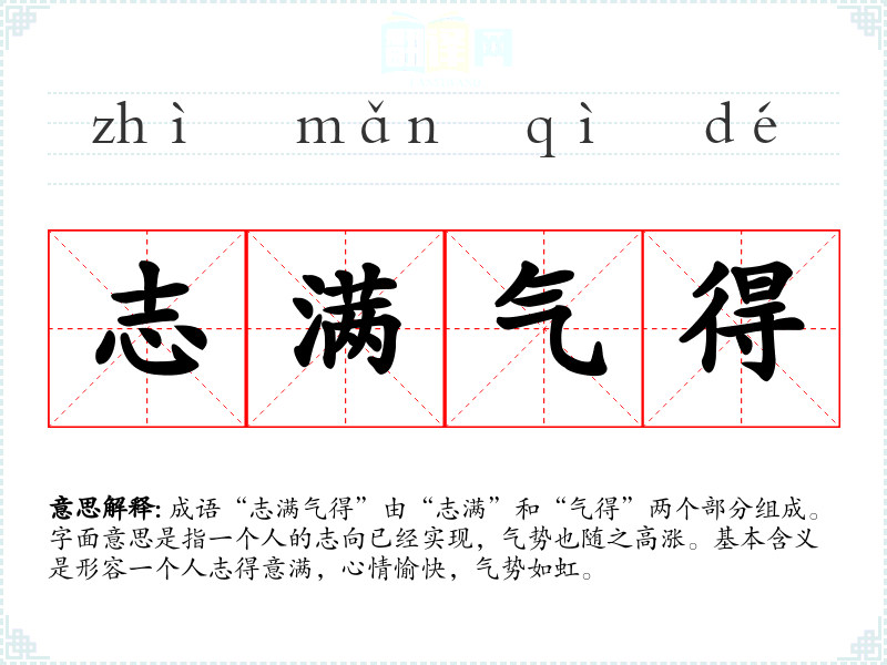 成语“志满气得”由“志满”和“气得”两个部分组成。字面意思是指一个人的志向已经实现,气势也随之高涨。基本含义是形容一个人志得意满,心情愉快,气势如虹。