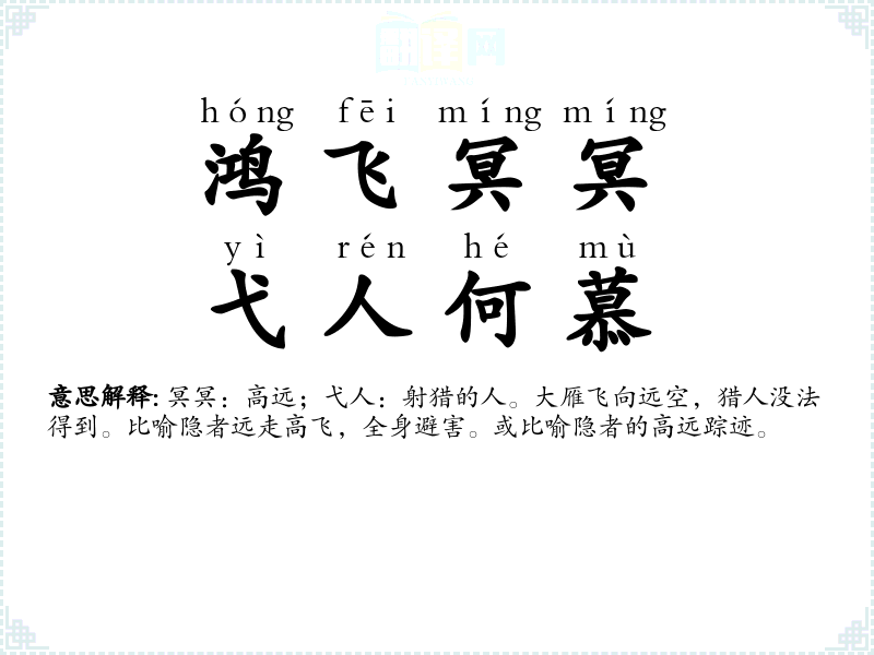 冥冥:高远;弋人:射猎的人。大雁飞向远空,猎人没法得到。比喻隐者远走高飞,全身避害。或比喻隐者的高远踪迹。 |