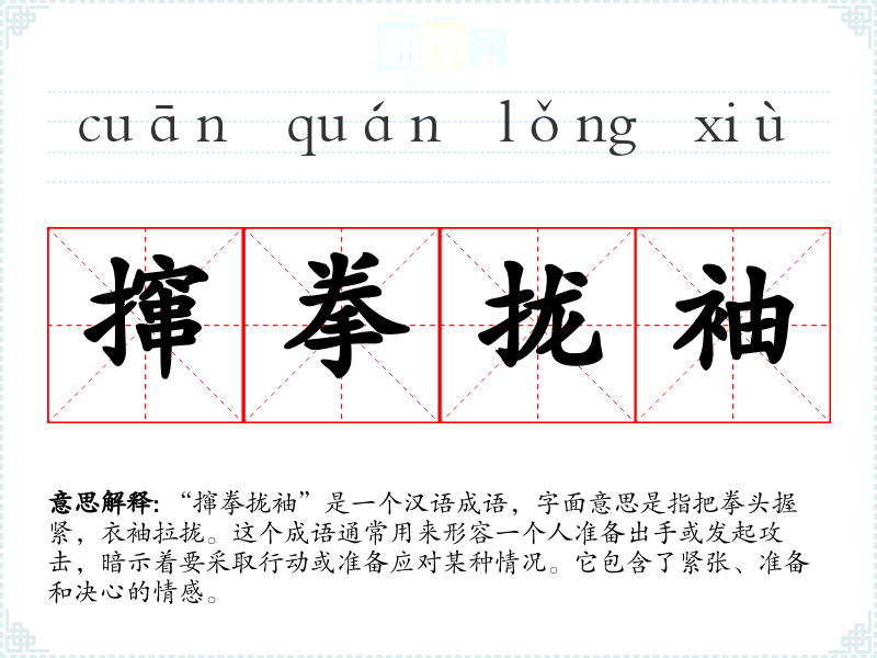 “撺拳拢袖”是一个汉语成语,字面意思是指把拳头握紧,衣袖拉拢。这个成语通常用来形容一个人准备出手或发起攻击,暗示着要采取行动或准备应对某种情况。它包含了紧张、准备和决心的情感。