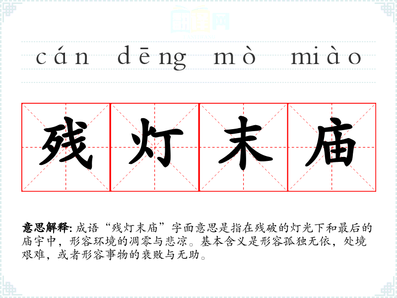 成语“残灯末庙”字面意思是指在残破的灯光下和最后的庙宇中,形容环境的凋零与悲凉。基本含义是形容孤独无依,处境艰难,或者形容事物的衰败与无助。