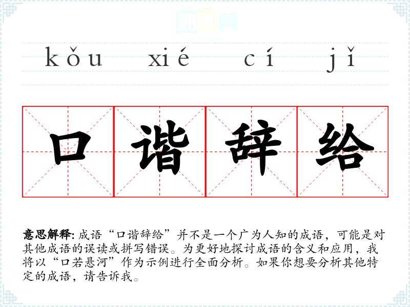 成语“口谐辞给”并不是一个广为人知的成语,可能是对其他成语的误读或拼写错误。为更好地探讨成语的含义和应用,我将以“口若悬河”作为示例进行全面分析。如果你想要分析其他特定的成语,请告诉我。