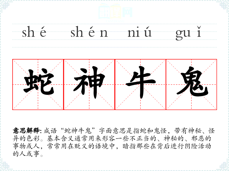 成语“蛇神牛鬼”字面意思是指蛇和鬼怪,带有神秘、怪异的色彩。基本含义通常用来形容一些不正当的、神秘的、邪恶的事物或人,常常用在贬义的语境中,暗指那些在背后进行阴险活动的人或事。