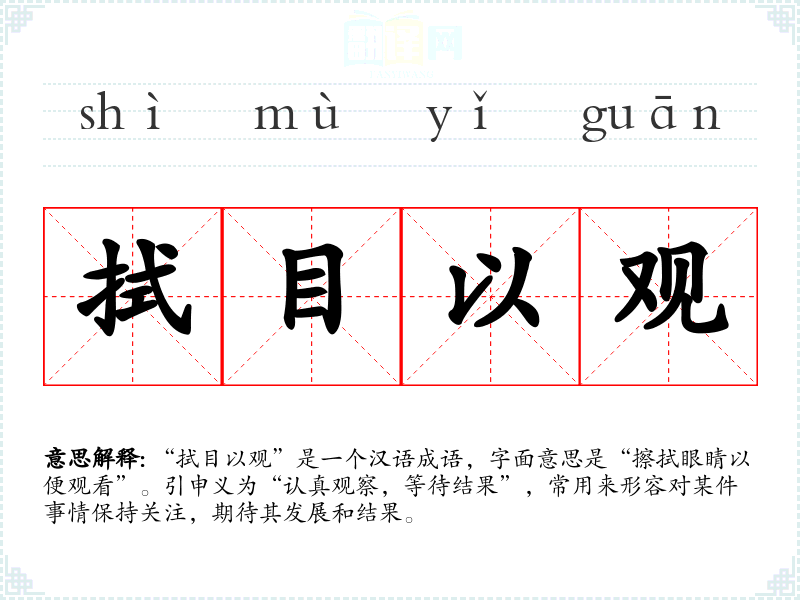 “拭目以观”是一个汉语成语,字面意思是“擦拭眼睛以便观看”。引申义为“认真观察,等待结果”,常用来形容对某件事情保持关注,期待其发展和结果。