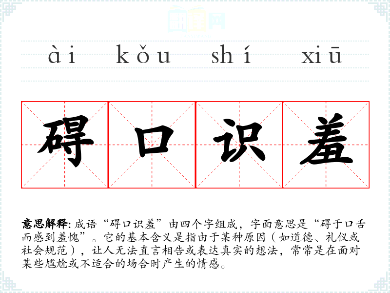 成语“碍口识羞”由四个字组成,字面意思是“碍于口舌而感到羞愧”。它的基本含义是指由于某种原因(如道德、礼仪或社会规范),让人无法直言相告或表达真实的想法,常常是在面对某些尴尬或不适合的场合时产生的情感。