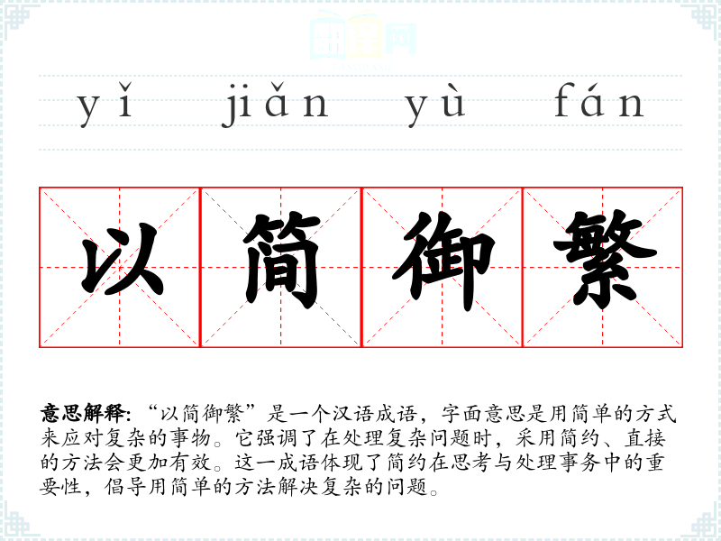 “以简御繁”是一个汉语成语,字面意思是用简单的方式来应对复杂的事物。它强调了在处理复杂问题时,采用简约、直接的方法会更加有效。这一成语体现了简约在思考与处理事务中的重要性,倡导用简单的方法解决复杂的问题。