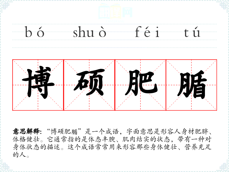“博硕肥腯”是一个成语,字面意思是形容人身材肥胖、体格健壮。它通常指的是体态丰腴、肌肉结实的状态,带有一种对身体状态的描述。这个成语常常用来形容那些身体健壮、营养充足的人。