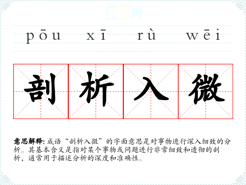 成语“剖析入微”的字面意思是对事物进行深入细致的分析。其基本含义是指对某个事物或问题进行非常细致和透彻的剖析,通常用于描述分析的深度和准确性。