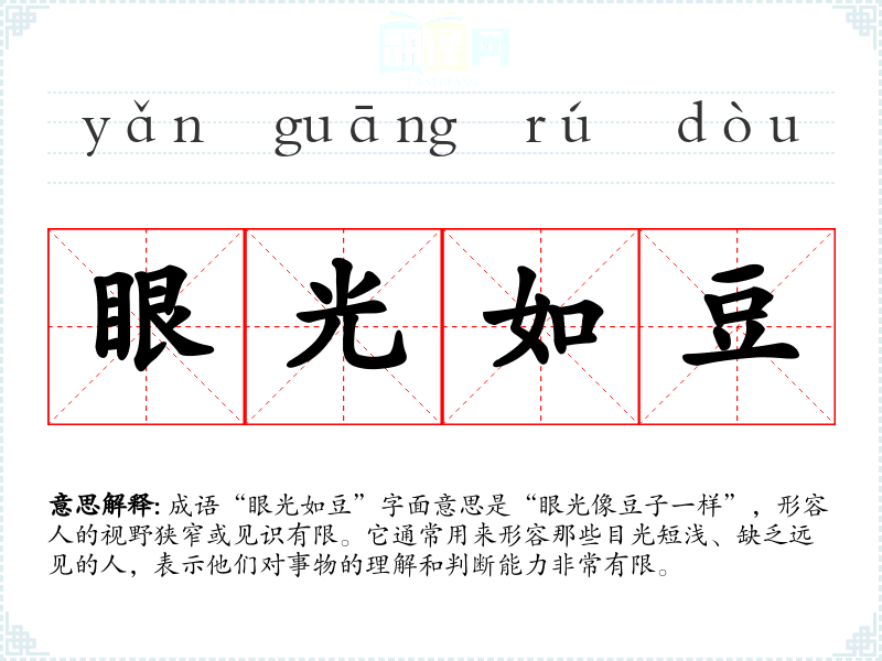 成语“眼光如豆”字面意思是“眼光像豆子一样”,形容人的视野狭窄或见识有限。它通常用来形容那些目光短浅、缺乏远见的人,表示他们对事物的理解和判断能力非常有限。