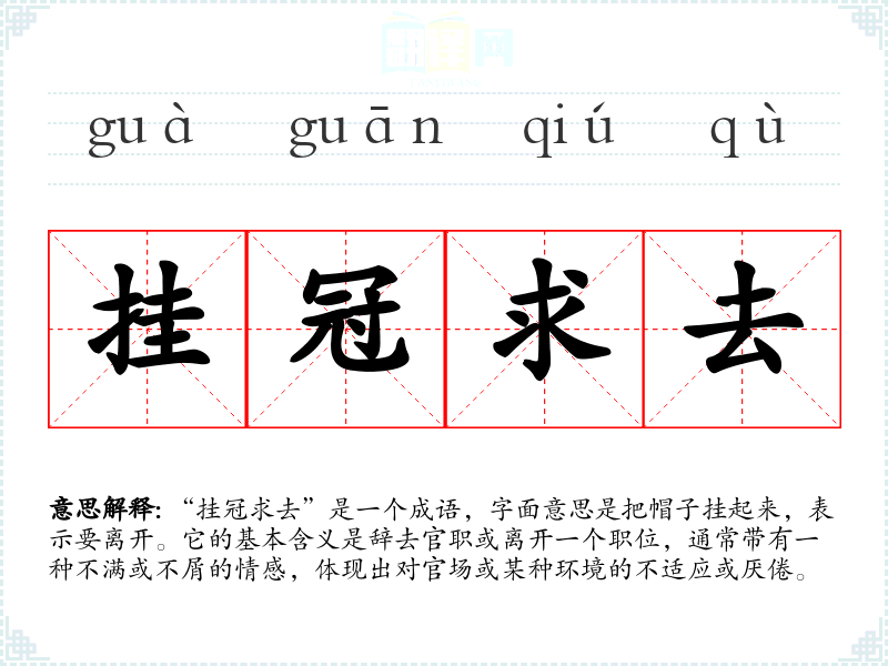 “挂冠求去”是一个成语,字面意思是把帽子挂起来,表示要离开。它的基本含义是辞去官职或离开一个职位,通常带有一种不满或不屑的情感,体现出对官场或某种环境的不适应或厌倦。