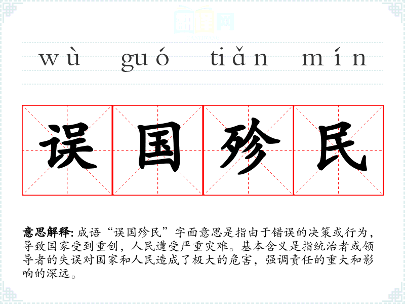 成语“误国殄民”字面意思是指由于错误的决策或行为,导致国家受到重创,人民遭受严重灾难。基本含义是指统治者或领导者的失误对国家和人民造成了极大的危害,强调责任的重大和影响的深远。
