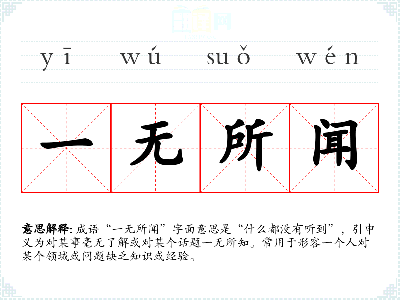 成语“一无所闻”字面意思是“什么都没有听到”,引申义为对某事毫无了解或对某个话题一无所知。常用于形容一个人对某个领域或问题缺乏知识或经验。