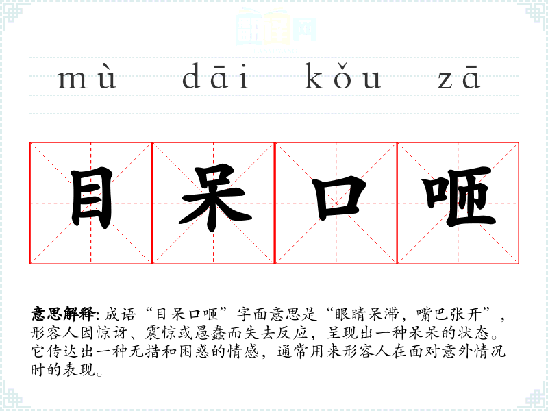 成语“目呆口咂”字面意思是“眼睛呆滞,嘴巴张开”,形容人因惊讶、震惊或愚蠢而失去反应,呈现出一种呆呆的状态。它传达出一种无措和困惑的情感,通常用来形容人在面对意外情况时的表现。