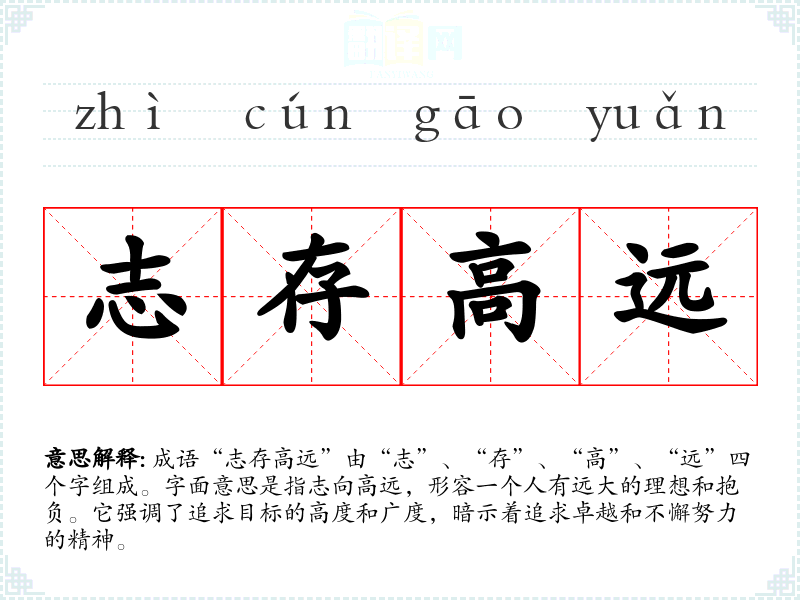 成语“志存高远”由“志”、“存”、“高”、“远”四个字组成。字面意思是指志向高远,形容一个人有远大的理想和抱负。它强调了追求目标的高度和广度,暗示着追求卓越和不懈努力的精神。