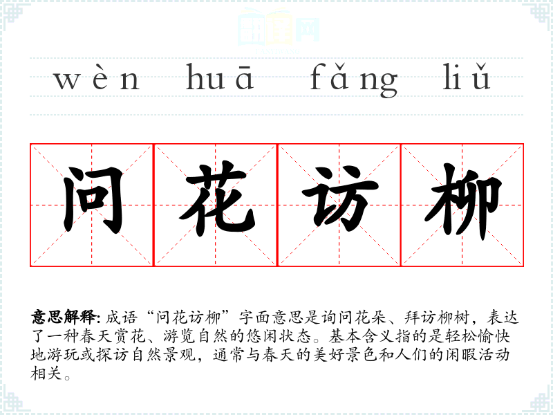- 日常对话:在朋友聚会或出游时,提到“问花访柳”可以表达一种轻松的心情或计划去游玩的意向。
