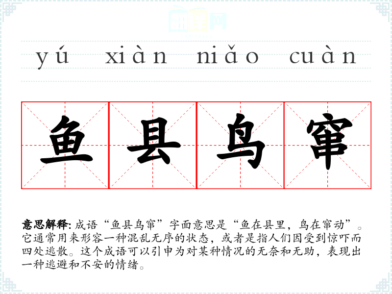 成语“鱼县鸟窜”字面意思是“鱼在县里,鸟在窜动”。它通常用来形容一种混乱无序的状态,或者是指人们因受到惊吓而四处逃散。这个成语可以引申为对某种情况的无奈和无助,表现出一种逃避和不安的情绪。