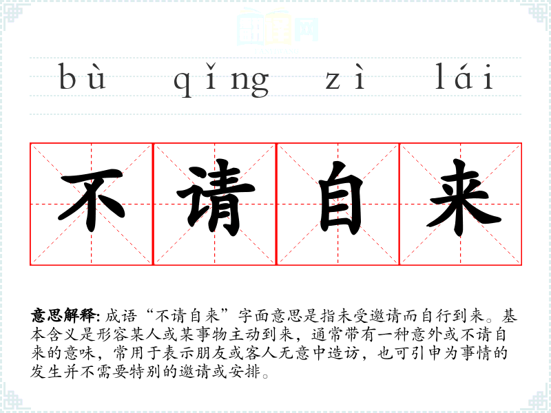 成语“不请自来”字面意思是指未受邀请而自行到来。基本含义是形容某人或某事物主动到来,通常带有一种意外或不请自来的意味,常用于表示朋友或客人无意中造访,也可引申为事情的发生并不需要特别的邀请或安排。