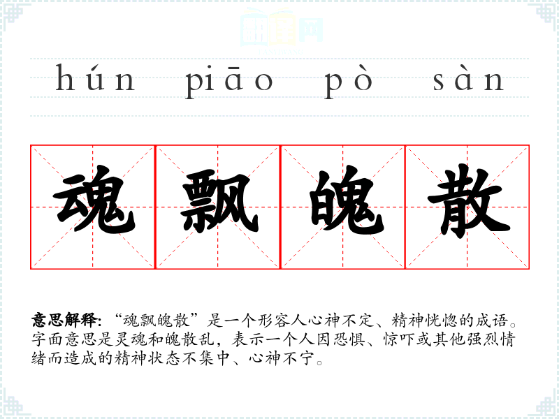 “魂飘魄散”是一个形容人心神不定、精神恍惚的成语。字面意思是灵魂和魄散乱,表示一个人因恐惧、惊吓或其他强烈情绪而造成的精神状态不集中、心神不宁。