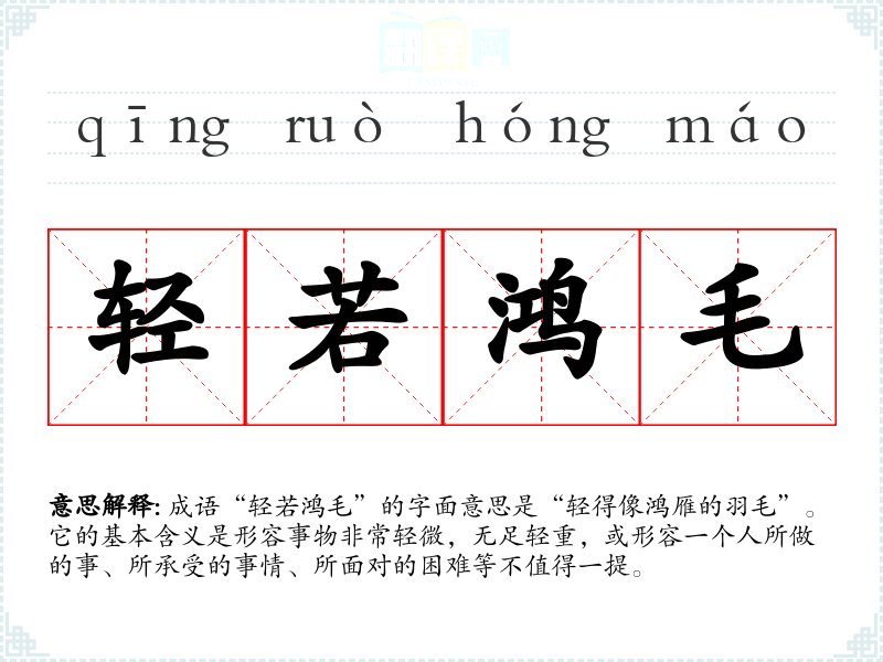 成语“轻若鸿毛”的字面意思是“轻得像鸿雁的羽毛”。它的基本含义是形容事物非常轻微,无足轻重,或形容一个人所做的事、所承受的事情、所面对的困难等不值得一提。