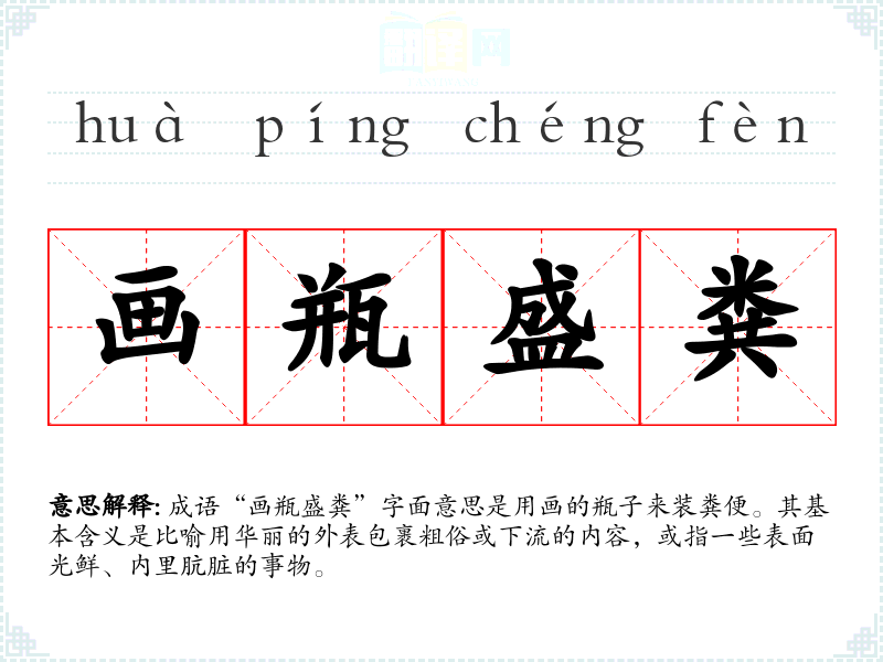 成语“画瓶盛粪”字面意思是用画的瓶子来装粪便。其基本含义是比喻用华丽的外表包裹粗俗或下流的内容,或指一些表面光鲜、内里肮脏的事物。