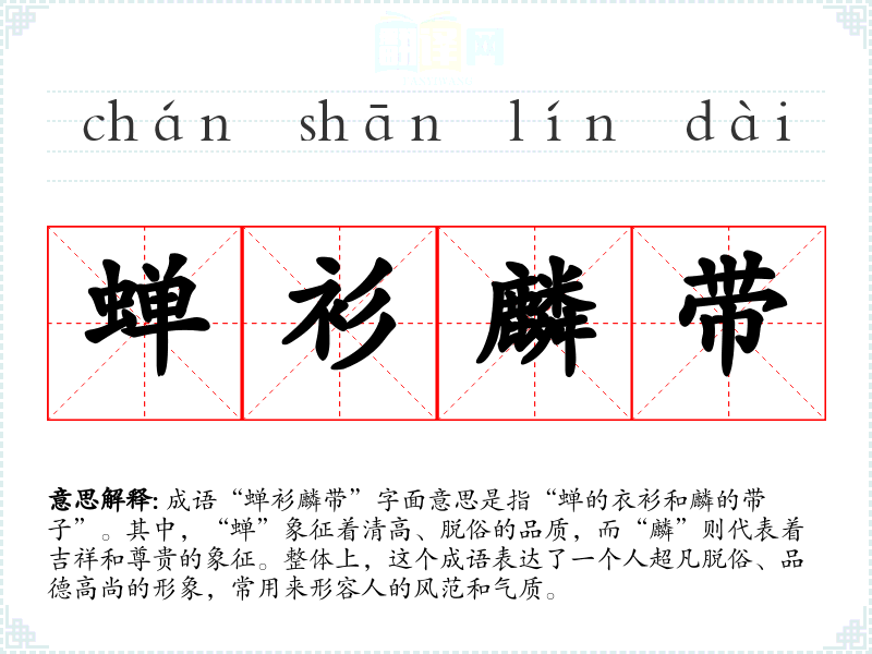 成语“蝉衫麟带”字面意思是指“蝉的衣衫和麟的带子”。其中,“蝉”象征着清高、脱俗的品质,而“麟”则代表着吉祥和尊贵的象征。整体上,这个成语表达了一个人超凡脱俗、品德高尚的形象,常用来形容人的风范和气质。