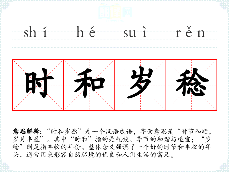 | 时和岁稔 | 四时和顺,五谷丰收。用以称颂太平盛世。同“时和年丰”。 |